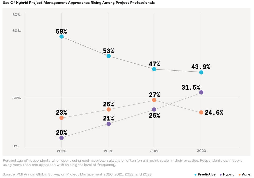 D’après le PMI (Project Management Institute), les approches hybrides ont le vent en poupe et leur adoption grandit année après année (en violet sur le schéma).